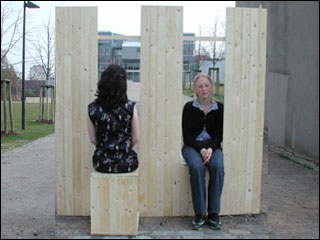 A fence... marks a border... one before and one behind... a closed surface... five elements... two hatches... take a seat... before... behind... in between... space experience of the other side... apportioned body... upper body in front... lower body in the back... experience the space in between... four sides... single rails... spaces... segments... experience of the other... bonding... fusion... frontier crossing... a fence stays a fence. April 2002 Folding Fence Fence Fancy* Art, interrelated to site, architecture and urban design 10 l 10