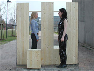A fence... marks a border... one before and one behind... a closed surface... five elements... two hatches... take a seat... before... behind... in between... space experience of the other side... apportioned body... upper body in front... lower body in the back... experience the space in between... four sides... single rails... spaces... segments... experience of the other... bonding... fusion... frontier crossing... a fence stays a fence. April 2002 Folding Fence Fence Fancy* Art, interrelated to site, architecture and urban design 08 l 10