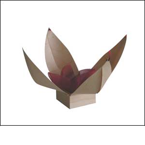 „Bud open yourself and show me your inner side”. (oder: inside) Four small, fine petals of thin veneer encase the 40 x 40 x 20 mm wooden box. Bedded and enclosed by gleaming silk, a special piece of jewellery may be placed inside. July 2000 Jewellerybox: Blossom Boxes + Co* 05 l 08