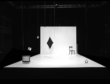 An appropriate stage design was developed for the final work of the study of Mime. A pure conception, which reminds on a bended sheet of paper, offers space where the actress gets into action with several stage props. February 2008 Tabula rasa* Stage design Stage design