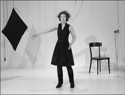 An appropriate stage design was developed for the final work of the study of Mime. A pure conception, which reminds on a bended sheet of paper, offers space where the actress gets into action with several stage props. February 2008 Tabula rasa* Stage design In action