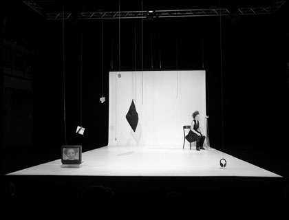 An appropriate stage design was developed for the final work of the study of Mime. A pure conception, which reminds on a bended sheet of paper, offers space where the actress gets into action with several stage props. February 2008 Tabula rasa* Stage design In action