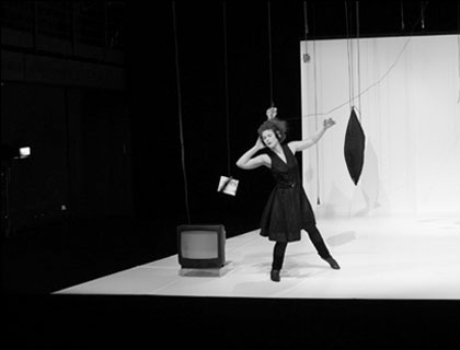 An appropriate stage design was developed for the final work of the study of Mime. A pure conception, which reminds on a bended sheet of paper, offers space where the actress gets into action with several stage props. February 2008 Tabula rasa* Stage design In action