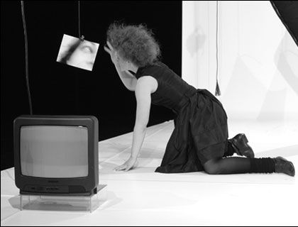 An appropriate stage design was developed for the final work of the study of Mime. A pure conception, which reminds on a bended sheet of paper, offers space where the actress gets into action with several stage props. February 2008 Tabula rasa* Stage design In action