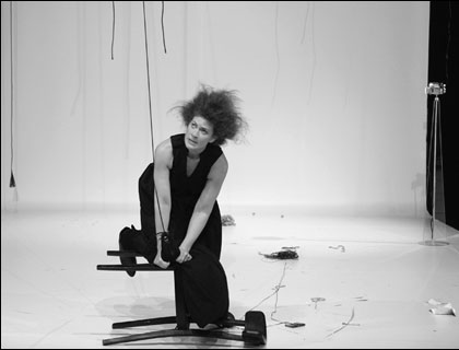 An appropriate stage design was developed for the final work of the study of Mime. A pure conception, which reminds on a bended sheet of paper, offers space where the actress gets into action with several stage props. February 2008 Tabula rasa* Stage design In action
